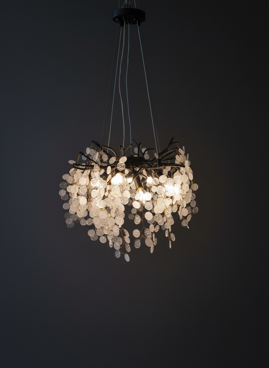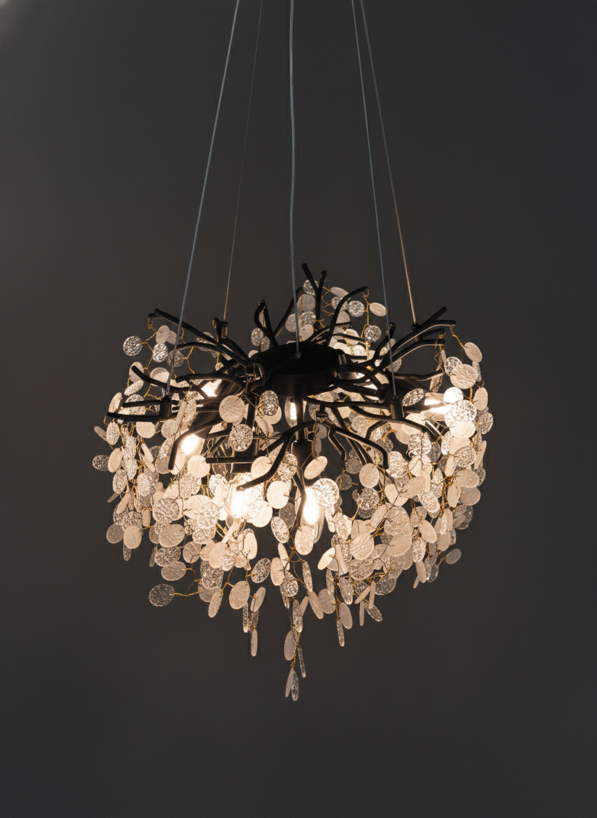 - جلوه برگهای شفاف: آویزهای کریستالی/شیشهای شفاف بافتدار، نور را به شکلی زیبا پراکنده میکنند و با کوچکترین جریان هوا، جنبش برگهای یک درخت را تداعی میکنند.