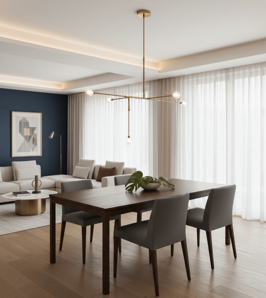 - فضاهای مسکونی (سالن پذیرایی و آشپزخانه جزیرهای): میتواند به عنوان نور اصلی در بالای میز ناهارخوری یا جزیره آشپزخانه قرار گیرد و تمرکز بصری را به نقطه دلخواه جلب کند.