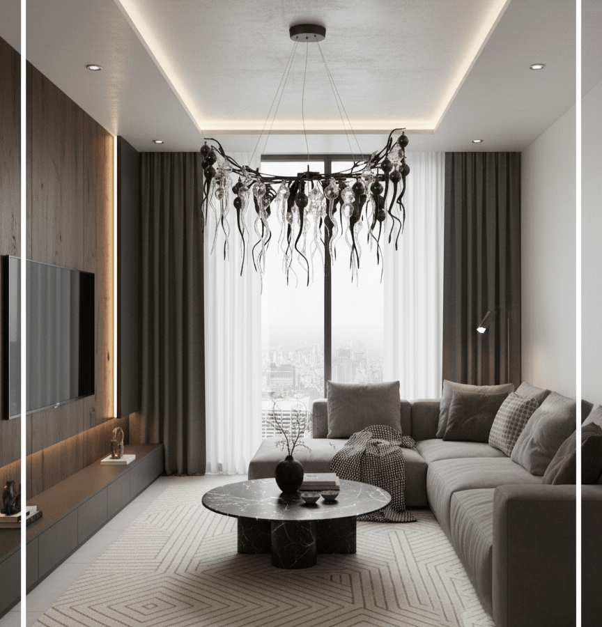 ​لوستر مدرن و مجلل با شاخه‌های فلزی مشکی و حباب‌های شیشه‌ای اشکی و پیچ‌خورده، آویزان در TV room لوکس.