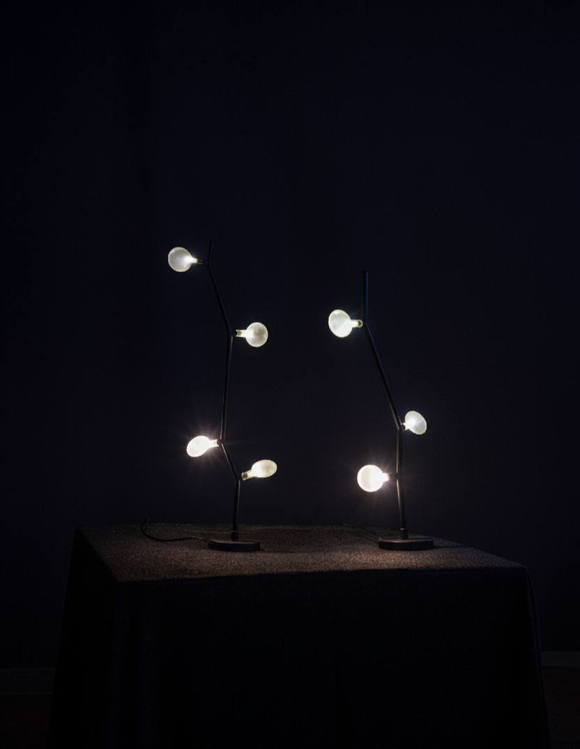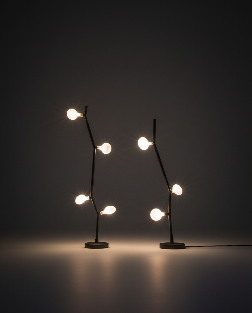 آباژور شاخه با یک طراحی جسورانه و در عین حال ظریف، به سرعت به کانون توجه هر فضایی تبدیل میشود. بدنه فلزی تیره و خطوط باریک آن، تضاد زیبایی با لامپهای حبابی شکل ایجاد میکند که نور را به شکلی گرم و مطبوع در فضا پراکنده میسازند.