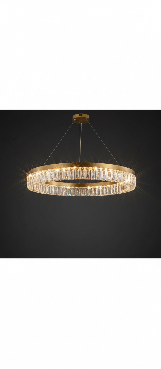 - حلقه زرین (بدنه): بدنه اصلی لوستر به شکل یک حلقه (تک رینگ) طراحی شده که با روکش فلزی با کیفیت بالا و رنگ طلایی براق پوشانده شده است. این رنگ گرم، حس غنا و شکوه را در فضا جاری میکند.