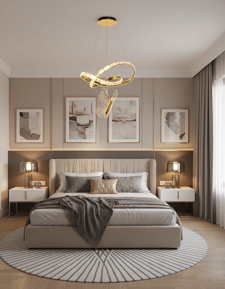 این لوستر آویز کریستالی با طراحی پروانه و فرمهای حلقوی پویا، نه تنها یک منبع روشنایی، بلکه یک اثر هنری دکوراتیو شاخص است. ترکیب رنگ طلایی براق با کریستالهای درخشان، جلوهای از لوکسگرایی (Glam) مدرن را به فضا میبخشد.