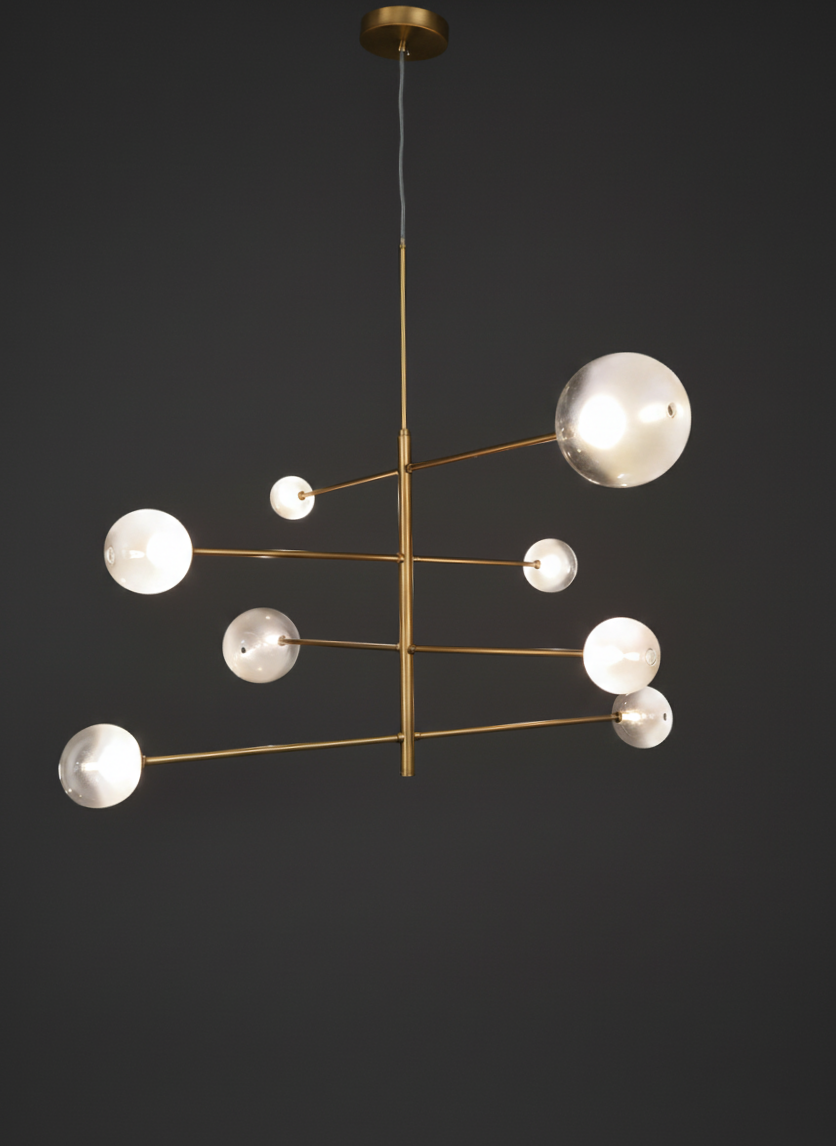 یکی از ویژگیهای متمایز کننده این لوستر پذیرایی مدرن، حبابهای شیشهای مه آلود آن است که با فرایند پیچیده سند بلاست روی پیرکس بسیار ظریف ایجاد شده، این حبابها نه تنها زیبایی بصری خیرهکنندهای دارند، بلکه با شکست نور، الگوی سایه و روشن دلنشینی در فضا ایجاد میکنند که فضای شما را از یکنواختی خارج میسازد.