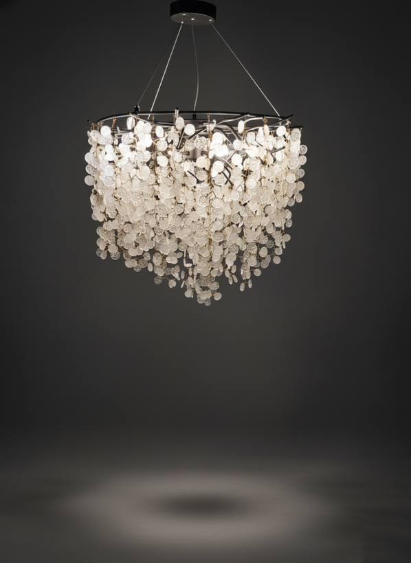 ویژگی متمایز این مدل، استفاده از تراکم بسیار بالای کریستالهای سکهای است. هر کریستال با ظرافت خاصی برش خورده تا بالاترین میزان شکست نور را داشته باشد. مهمتر از آن، ارتفاع آویز کریستالها در این نسخه دو برابر مدل اقتصادی است که باعث میشود جلوه آبشاری و پوششدهی نور آن، لوکس و پرتجمل به نظر برسد. با کوچکترین وزش هوا، این کریستالهای متراکم سکهای مانند برگهای یک درخت درخشان، به حرکت درآمده و انعکاسهای نور خیرهکنندهای را در کل فضا پخش میکنند.