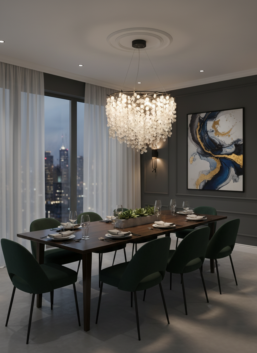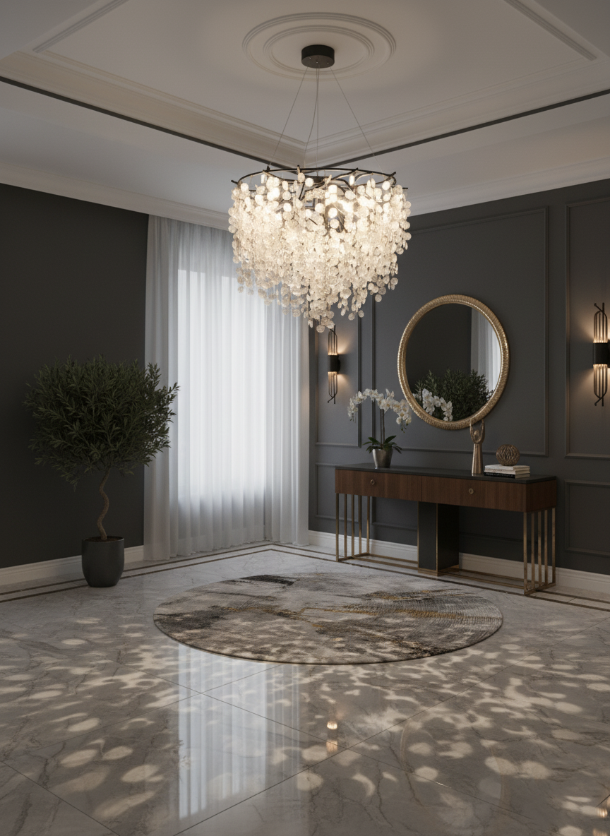ویژگی متمایز این مدل، استفاده از تراکم بسیار بالای کریستالهای سکهای است. هر کریستال با ظرافت خاصی برش خورده تا بالاترین میزان شکست نور را داشته باشد. مهمتر از آن، ارتفاع آویز کریستالها در این نسخه دو برابر مدل اقتصادی است که باعث میشود جلوه آبشاری و پوششدهی نور آن، لوکس و پرتجمل به نظر برسد. با کوچکترین وزش هوا، این کریستالهای متراکم سکهای مانند برگهای یک درخت درخشان، به حرکت درآمده و انعکاسهای نور خیرهکنندهای را در کل فضا پخش میکنند.