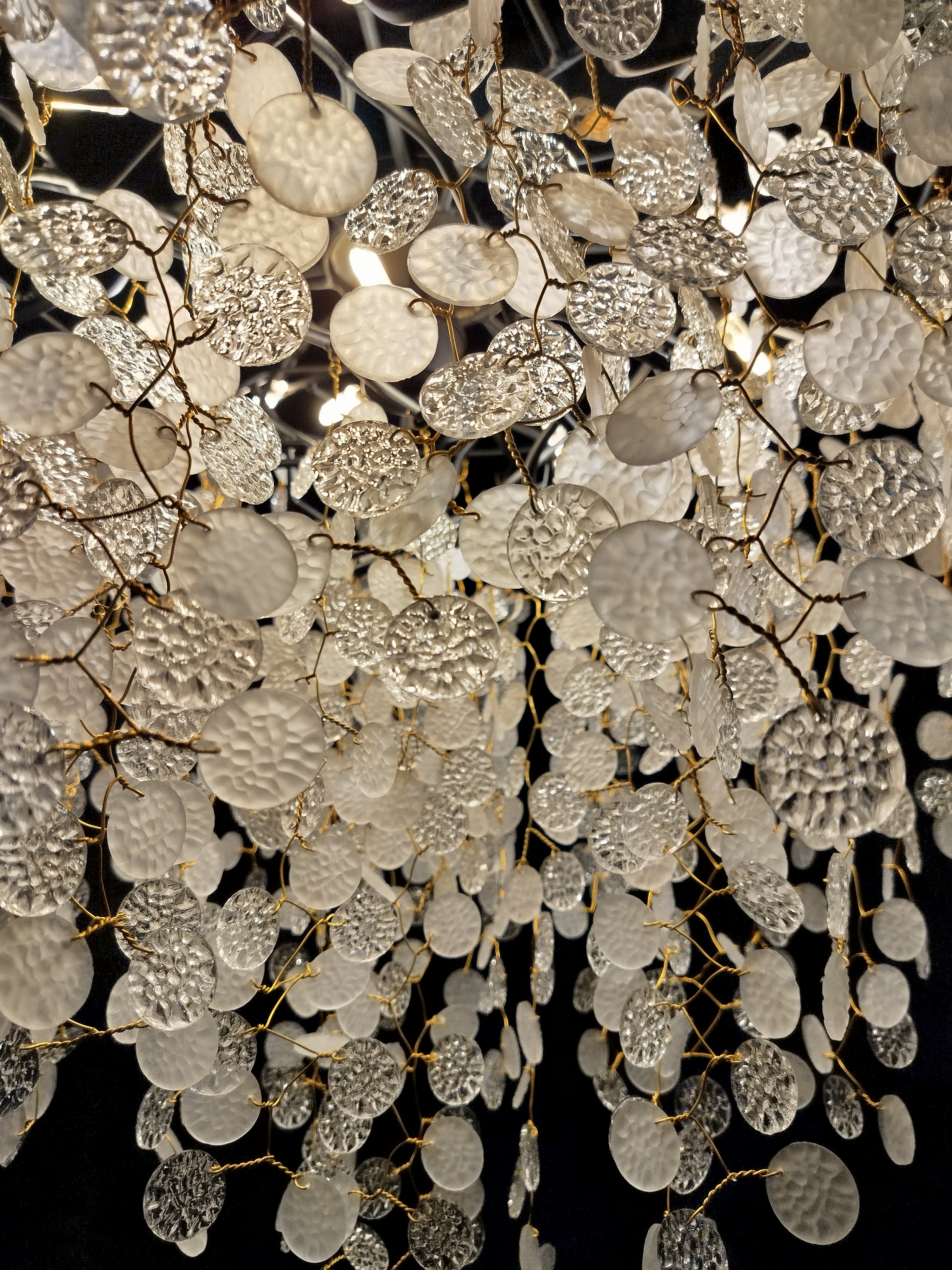 کریستالهای سکهای این لوستر از نوع سوپر کریستال با شفافیت بالا انتخاب شدهاند. نکته ظریفی که در طراحی این حبابها به کار رفته، وجود خطوط و بافتهای نامنظم روی سطح کریستال است. این بافتها عامدانه بوده و نقش بسزایی در زیبایی و پخش نور دارند؛ آنها باعث میشوند که نور ساطع شده، به جای یک بازتاب صاف و ساده، به صورت هزاران ستاره کوچک و پراکنده در فضا پخش شود و حسی از عمق، گرمی و حرکت نور را ایجاد کند که در لوسترهای کریستالی معمولی دیده نمیشود.