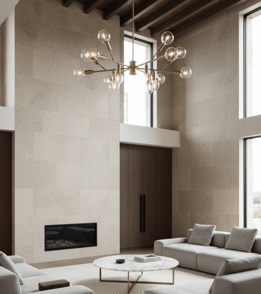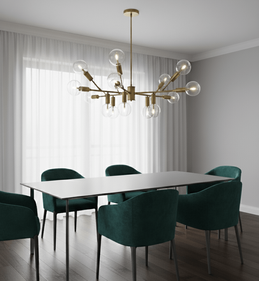 لوستر فانتزی 15 شاخه طلایی با حباب‌های گرد شیشه‌ای، مناسب برای دکوراسیون پذیرایی و اتاق خواب مدرن