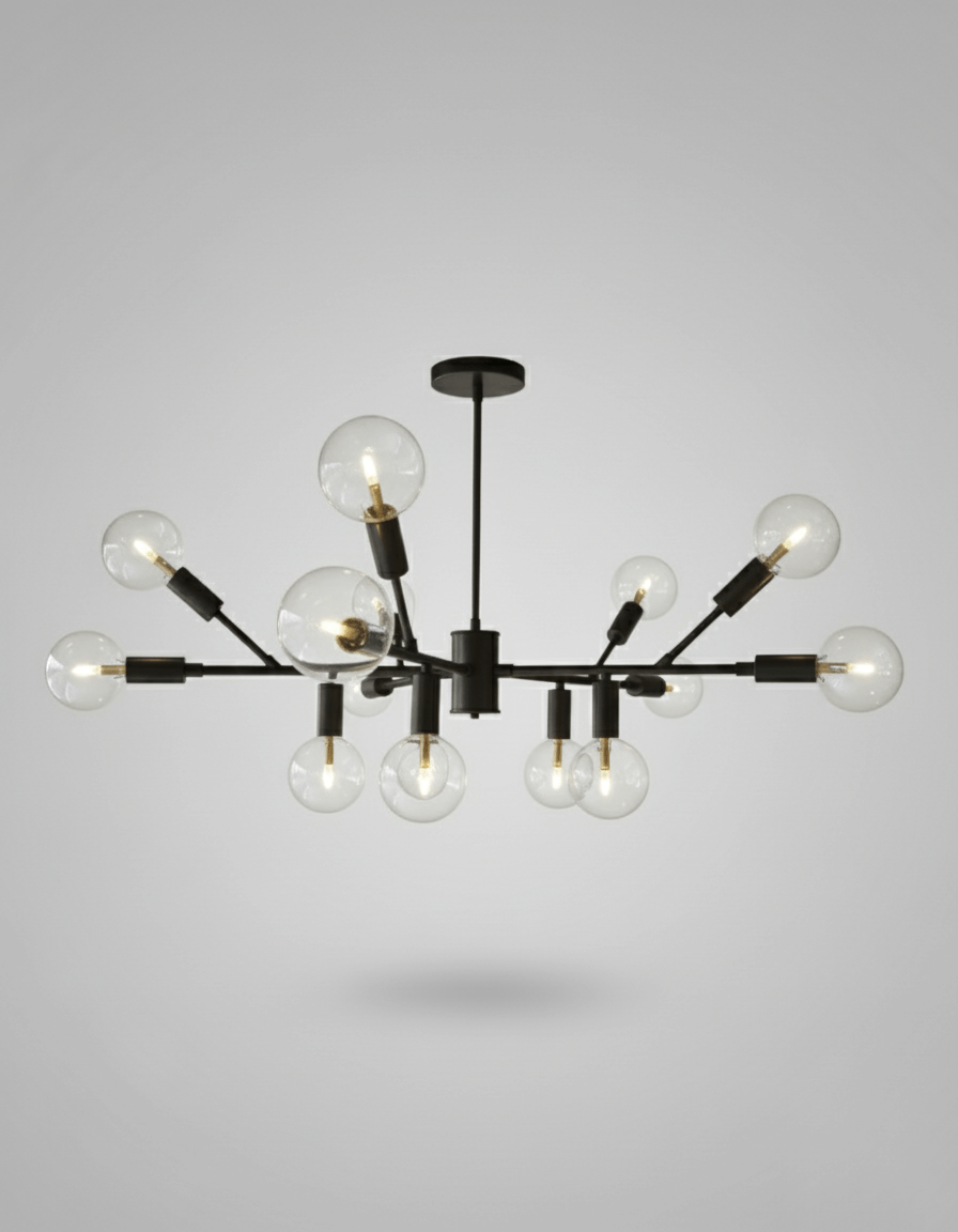 لوستر مدرن 15 شعله با بدنه فلزی مشکی مات و حباب‌های شیشه‌ای شفاف کروی، طرح اسپوتنیک شاخه‌دار